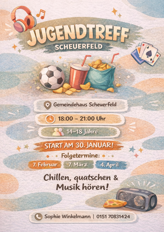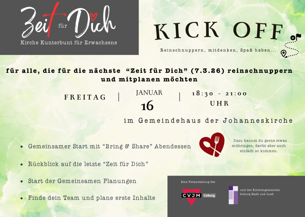 Mach dich auf eine Reise in die Welt des christlichen Glaubens. Vom 10. Januar bis 14. März kannst du immer samstags von 9 bis 11 Uhr im Gemeindezentrum elia&co (Max-Böhme-Ring 26) mit anderen bei einem leckeren Frühstück den Glauben (neu) entdecken und darüber ins Gespräch kommen. Parallel dazu gibt es ein Kinderprogramm. Infos und Anmeldung bei Evi Heinke (evelyn.heinke@elkb.de).