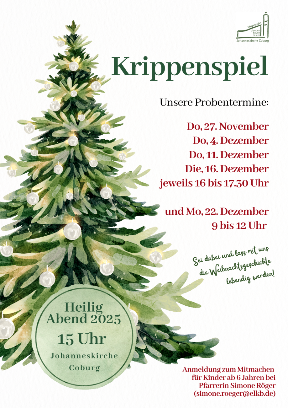 An Heilig Abend in der Johanneskirche bekommt das Jesuskind Besuch von Tieren. Dafür brauchen wir dich! Werde ein Teil unsres Krippenspielteams und lass mit uns die Weihnachtsgeschichte lebendig werden. Mitmachen können alle Kinder ab 6 Jahren. Wir proben im Gemeindesaal der Johanneskirche. Aufführen werden wir unser Stück am 24. Dezember um 15 Uhr im Familiengottesdienst in der Johanneskirche.